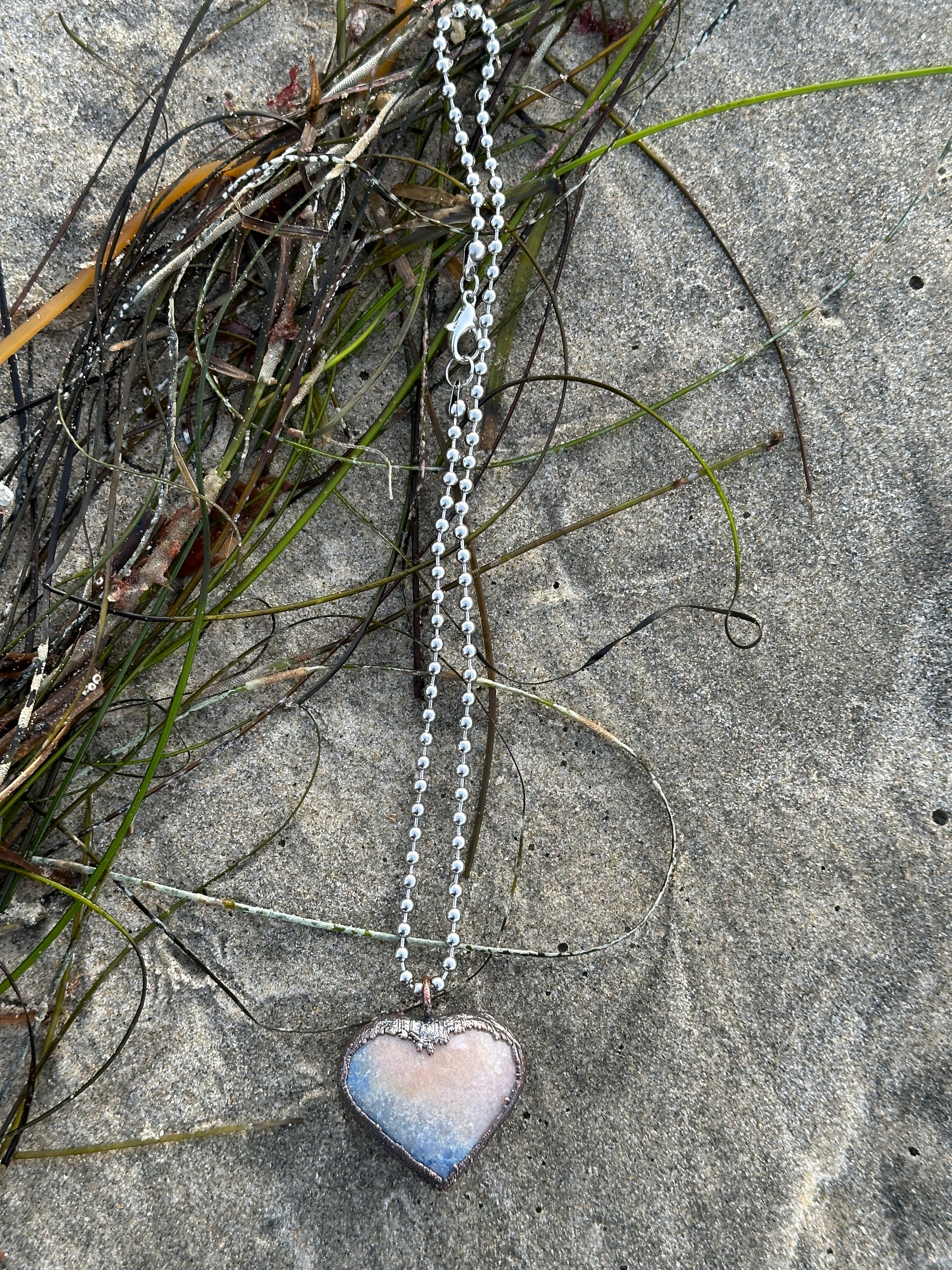 This electroformed Trolleite heart pendant measures approximately 1 3/8" wide and 1/4" thick and hangs from a 15" stainless steel chain with a 4" extender for adjustability and layering options.