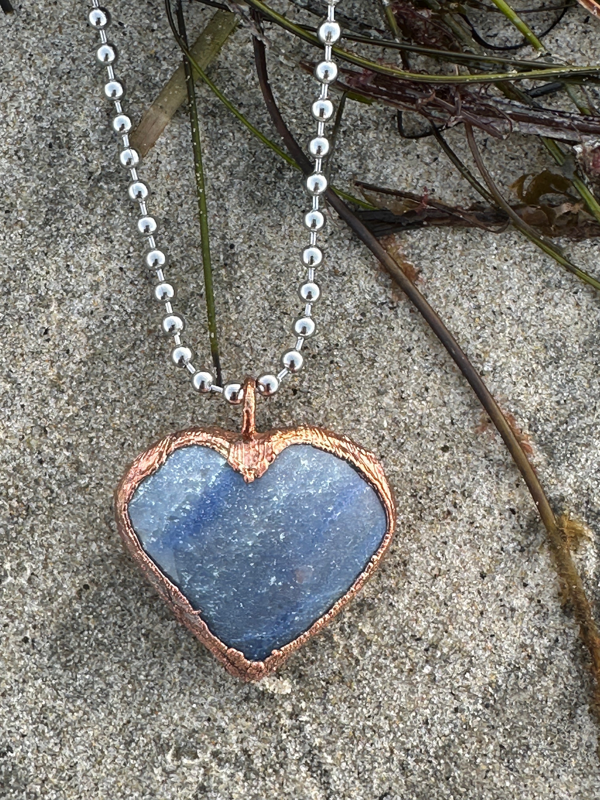 This electroformed Trolleite heart pendant measures approximately 1 3/8" wide and 1/4" thick and hangs from a 15" stainless steel chain with a 4" extender for adjustability and layering options.