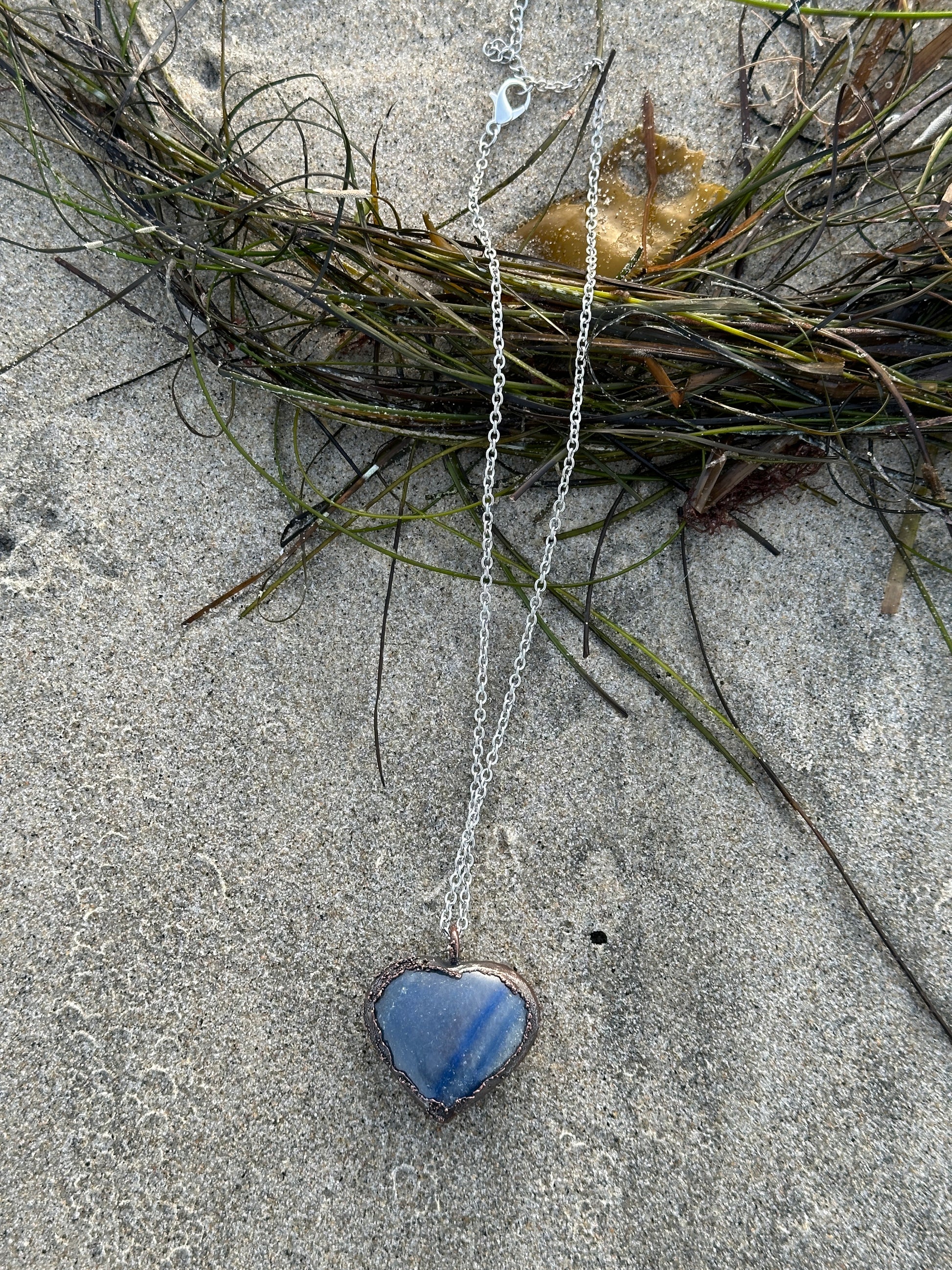 This electroformed Trolleite heart pendant measures approximately 1 3/8" wide and 1/4" thick and hangs from a 15" stainless steel chain with a 4" extender for adjustability and layering options.