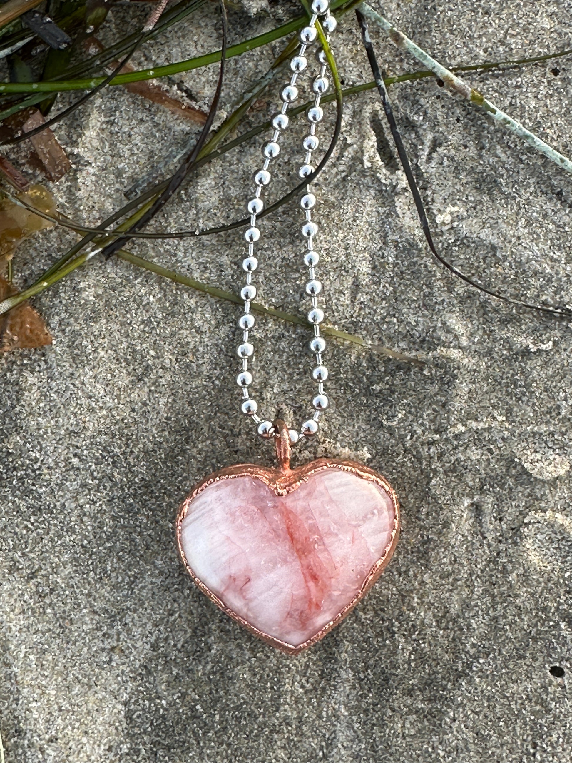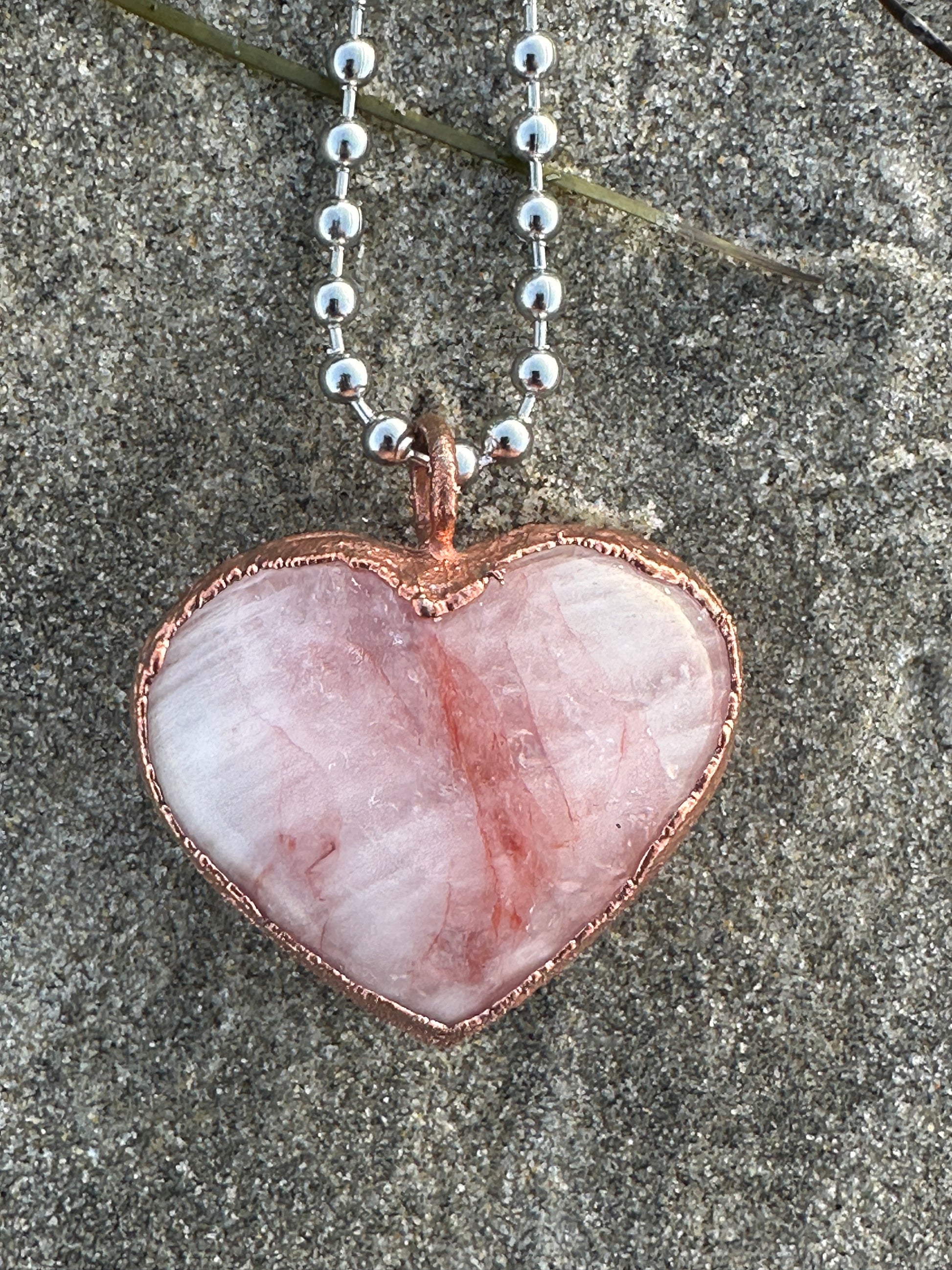 This electroformed Hematite Quartz heart pendant measures approximately 1 1/2'' wide and 1 1/4'' tall and hangs from a 15" stainless steel chain with a 4" extender for adjustability and layering options.