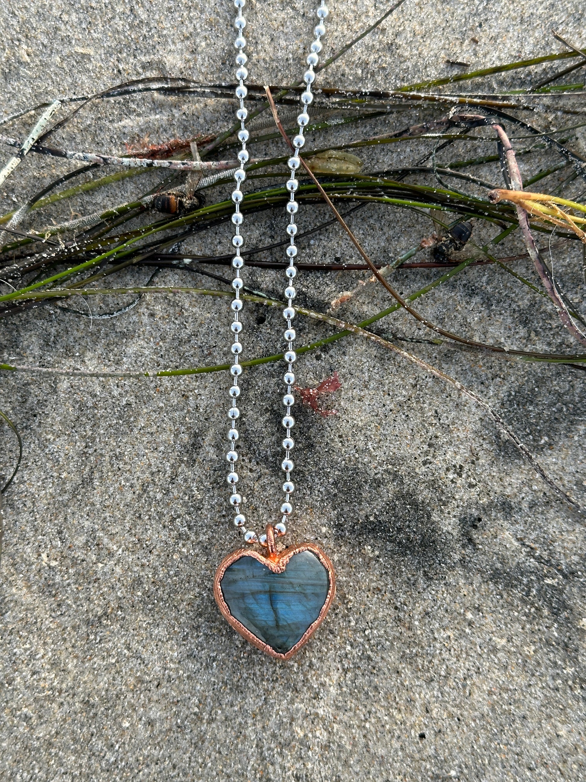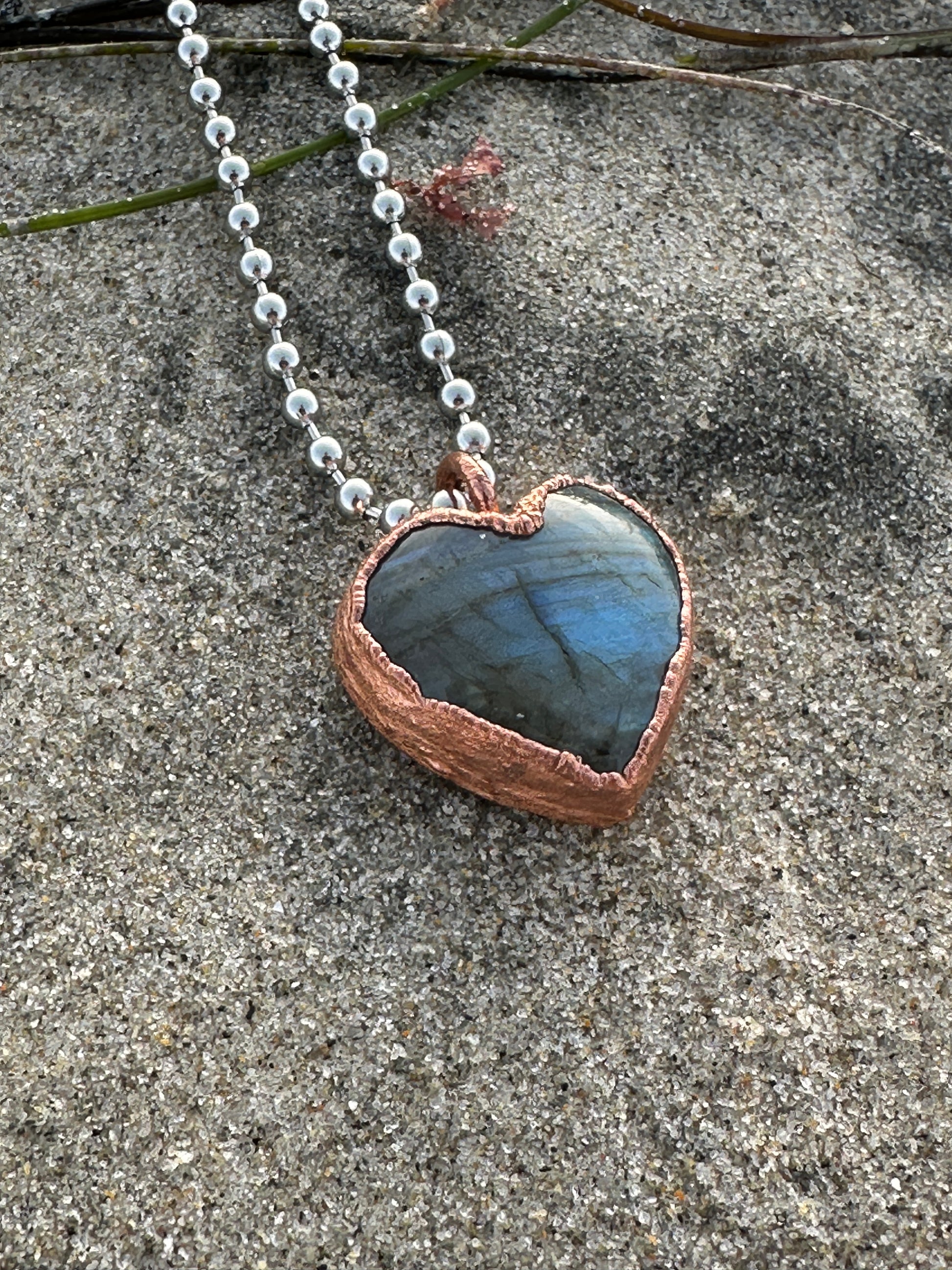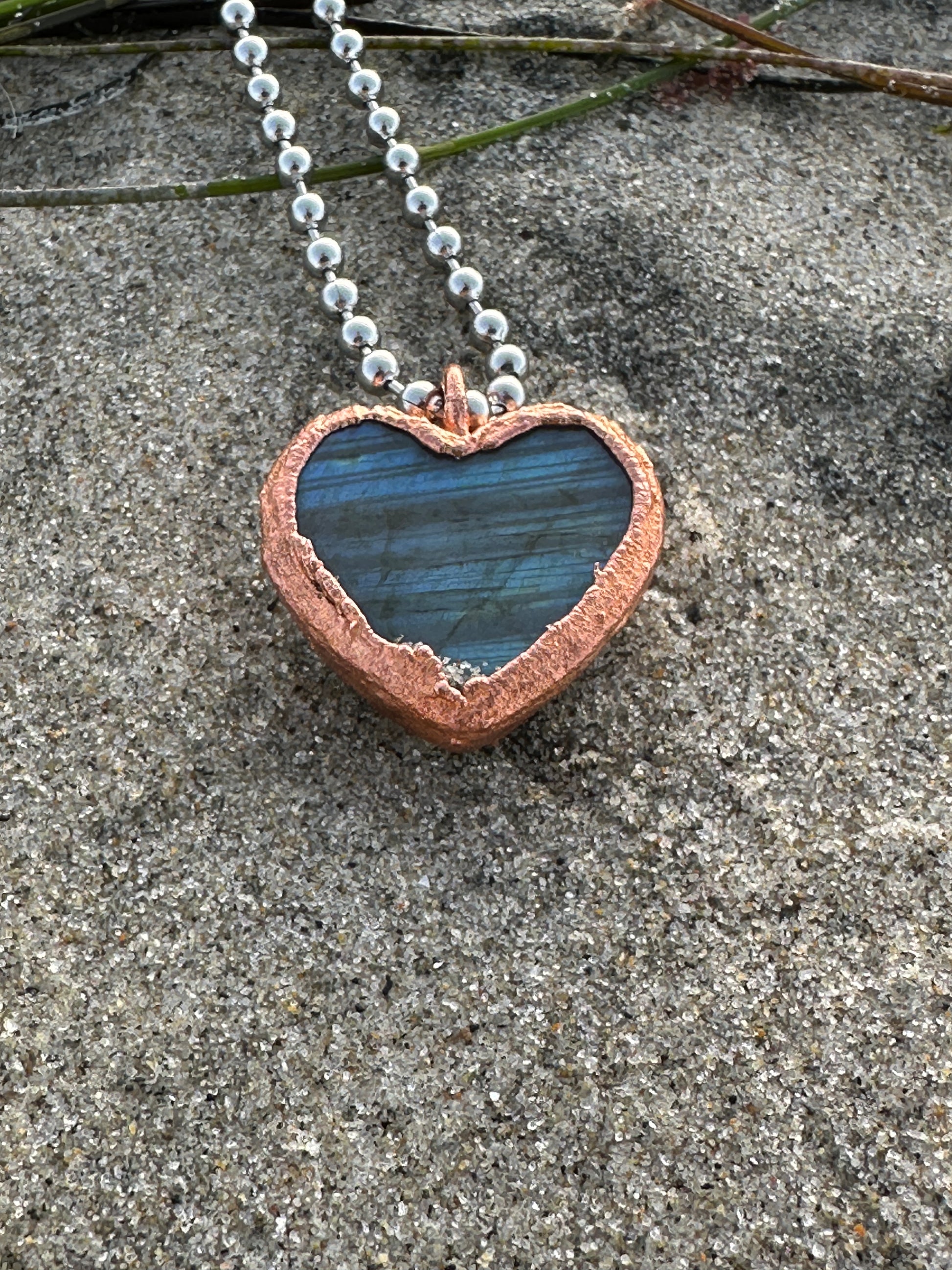 This electroformed Labradorite heart pendant measures approximately 5/8''-1 1/4" wide, 5/8''- 1/4'' tall and hangs from a 15" stainless steel chain with a 4" extender for adjustability and layering options.