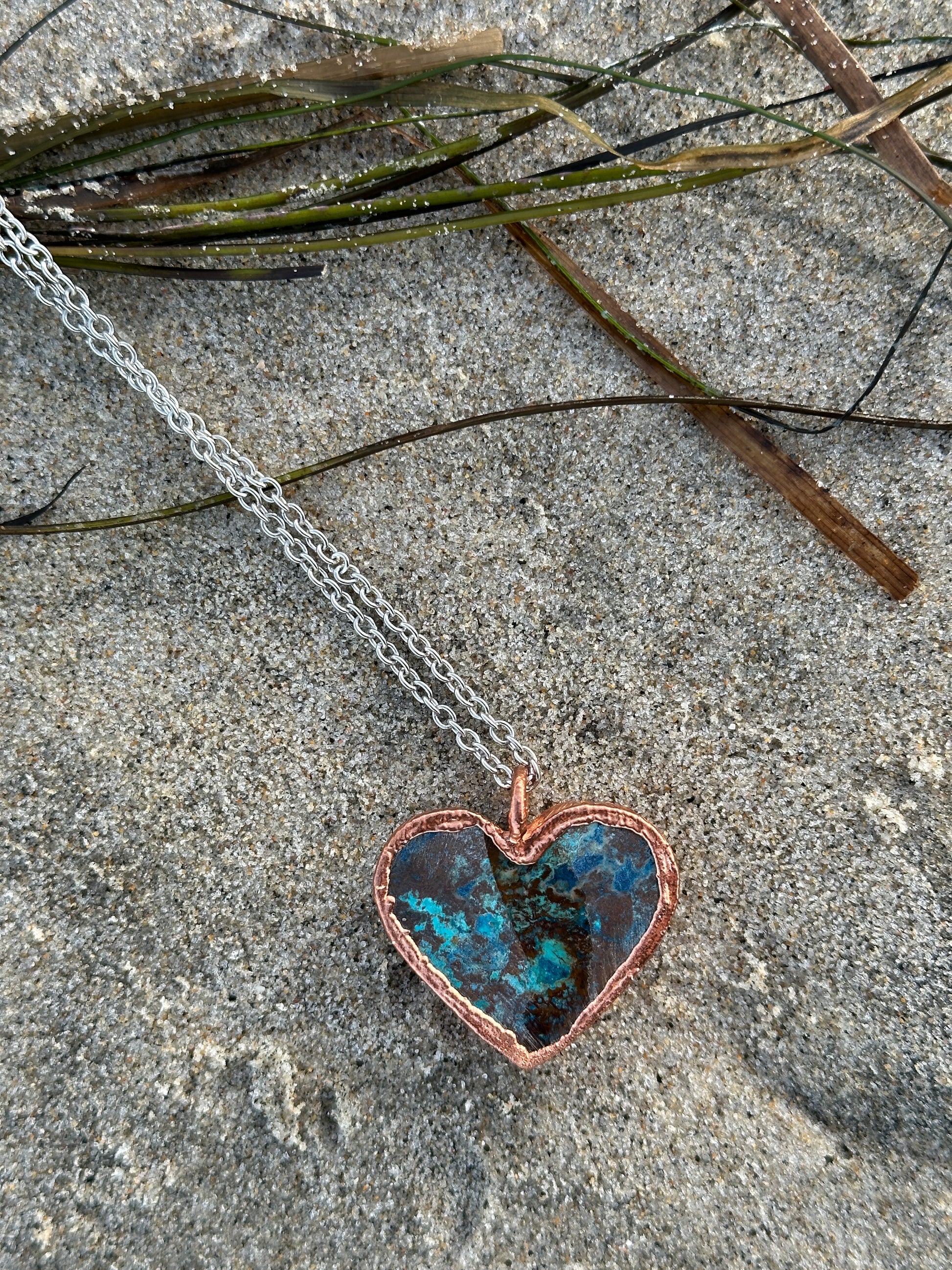 This electroformed hand-carved and polished Shattuckite heart pendant measures approximately 3/4'' - 1'' wide and 3/4''- 1'' long and hangs from a 15" stainless steel chain with a 4" extender for adjustability and layering options.