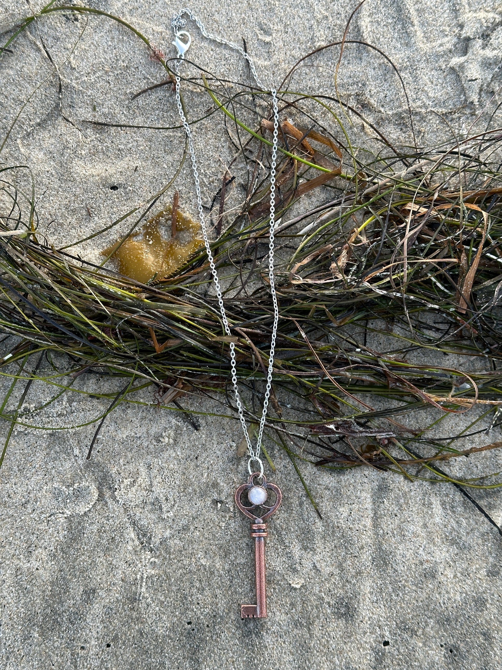 Copper key pendant adorned with Rainbow Moonstone measures ~ 2.5" and hangs from a 16" stainless steel chain with 3" extender.